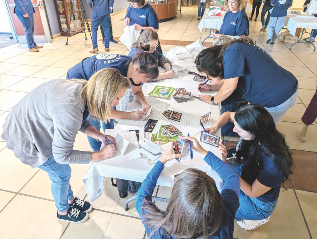 (Photo by Evan Bevins) Highmark employees sign holiday greeting cards to include with snack bags for Mountaineer Food Bank’s Veterans Table program at the company’s West Virginia corporate headquarters in Parkersburg. Highmark also announced its (un)Hungry campaign to fight food insecurity.