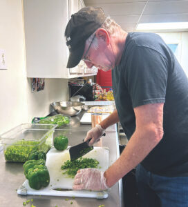 (Photo by Art Smith) Volunteer Fred Esker cuts up green peppers to be used in a dish that was being prepared.