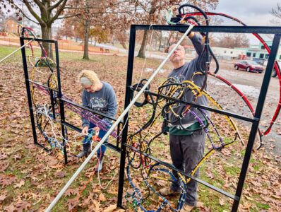 - (Photo by Evan Bevin) Some of the approximately 30,000 zip ties used for Holiday in the Park displays in Parkersburg City Park keep lights attached to a frame Saturday.