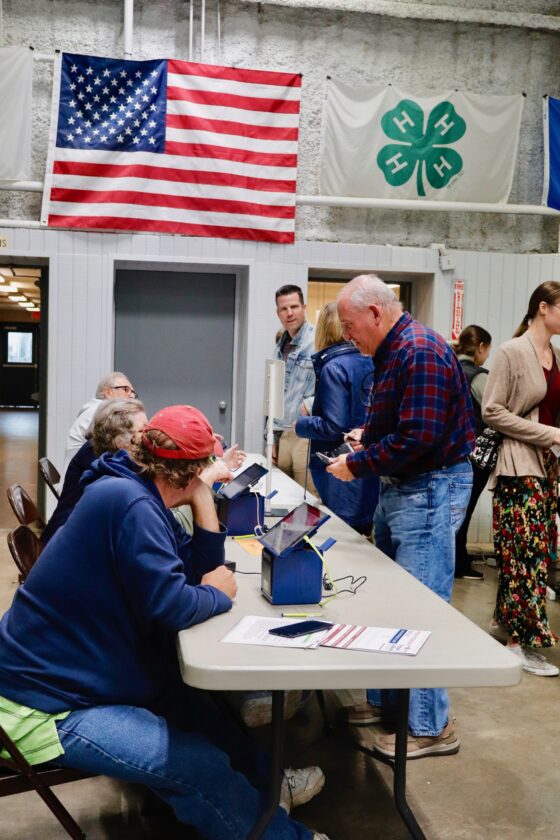 (Photo by Gwen Sour) Voters get their IDs checked while preparing to vote at the Washington County Fairgrounds on Tuesday.