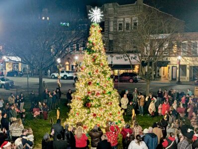 Marietta Main Street held its annual Merry-Etta Christmas tree lighting Saturday evening, drawing around 150 people to the Armory lawn for the event, which included hot chocolate provided by Huntington Bank and Christmas carols from Paskawych Entertainment.