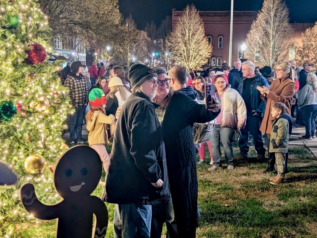 (Photo by Evan Bevins) Belpre residents Charles and Patricia Eberhard take a selfie in front of the Christmas tree on the Armory lawn following its lighting Saturday.