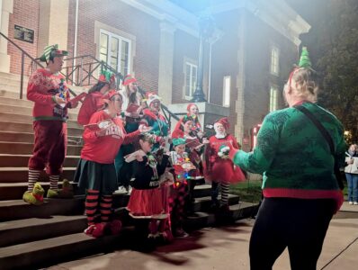 (Photo by Evan Bevins) Performers from Paskawych Entertainment sing “Up on the Housetop” on the steps of the Armory prior to Saturday’s Christmas tree lighting.