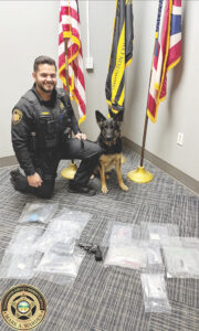 Photo provided Washington County Sheriff’s Deputy Johnathan Tucker and K9 Ozna are shown with alleged drugs recovered in a Tuesday arrest in Washington County.