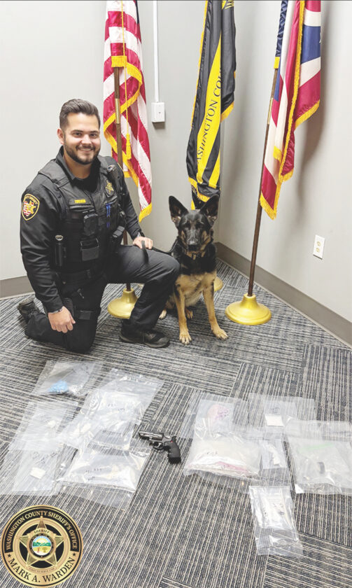 - Photo provided Washington County Sheriff’s Deputy Johnathan Tucker and K9 Ozna are shown with alleged drugs recovered in a Tuesday arrest in Washington County.