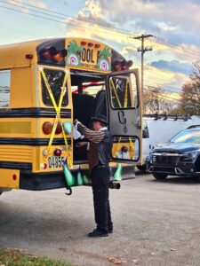 Aaron Oliver, a bus driver for the Belpre City Schools district, prepares a haunted house on a school bus.