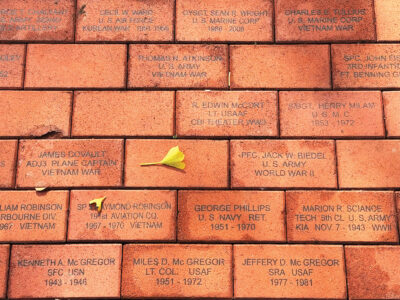 - (Photo by Amber Phipps) A gingko leaf rests on the bricks at the Veterans Walk of Honor memorial during the Brick Placement Ceremony on Saturday.