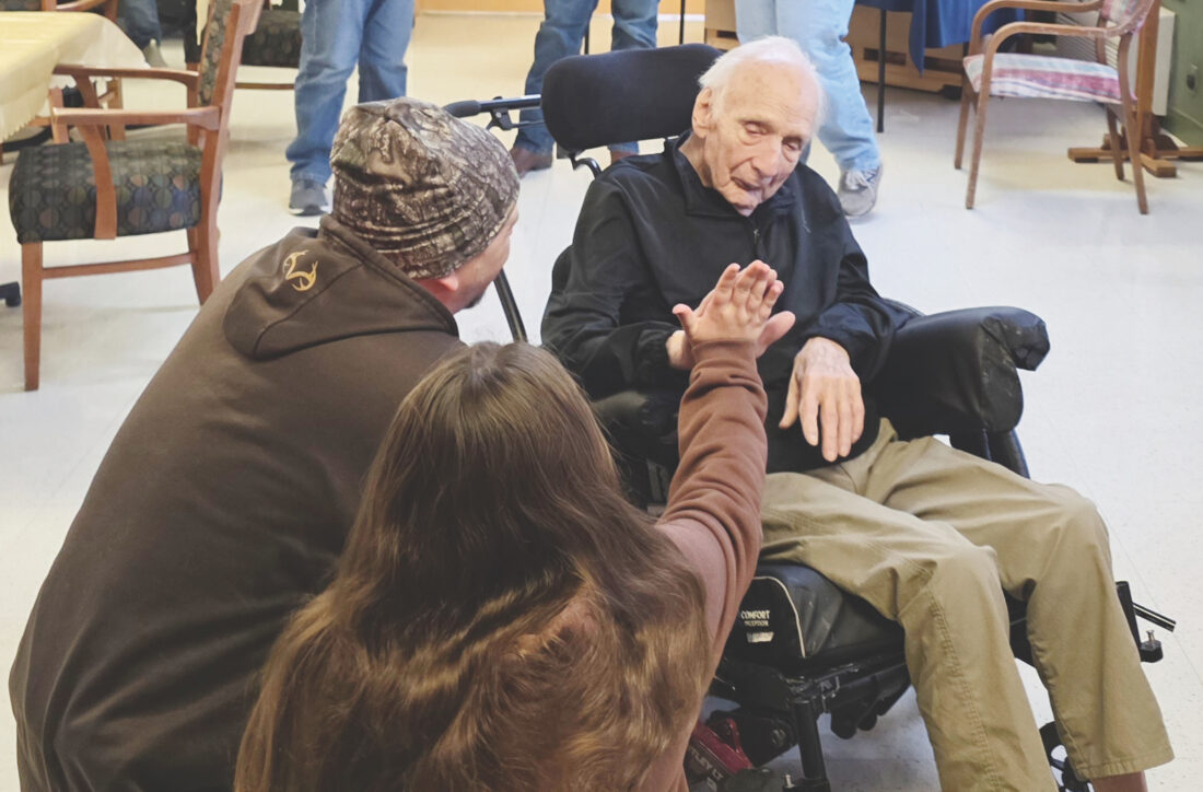 - (Photo by Gwen Sour) From left, Josh Bauer watches as Evelyn Bauer receives a high five from her great-grandfather, Ted Bauer, on Tuesday during Ted’s 104th birthday celebration.