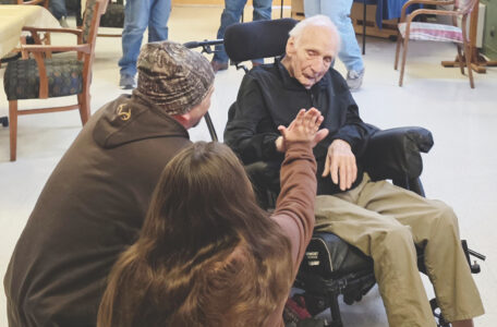 (Photo by Gwen Sour) From left, Josh Bauer watches as Evelyn Bauer receives a high five from her great-grandfather, Ted Bauer, on Tuesday during Ted’s 104th birthday celebration.