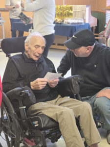 - (Photo by Gwen Sour) From left, Ted Bauer looks over family photos alongside his grandson, Brad Bauer, during his 104th birthday celebration in Marietta on Tuesday.