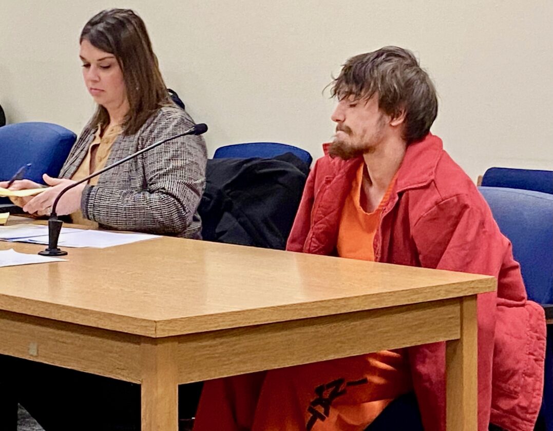(Photo by Brett Dunlap) Defense Attorney Angela Brunicardi Doss sits with Butch Wayne Knight during a bond hearing Tuesday in the court of Wood County Circuit Judge Jason Wharton. Bond was denied for Knight who is accused of murder and attempted murder from a shooting incident last week in south Parkersburg.