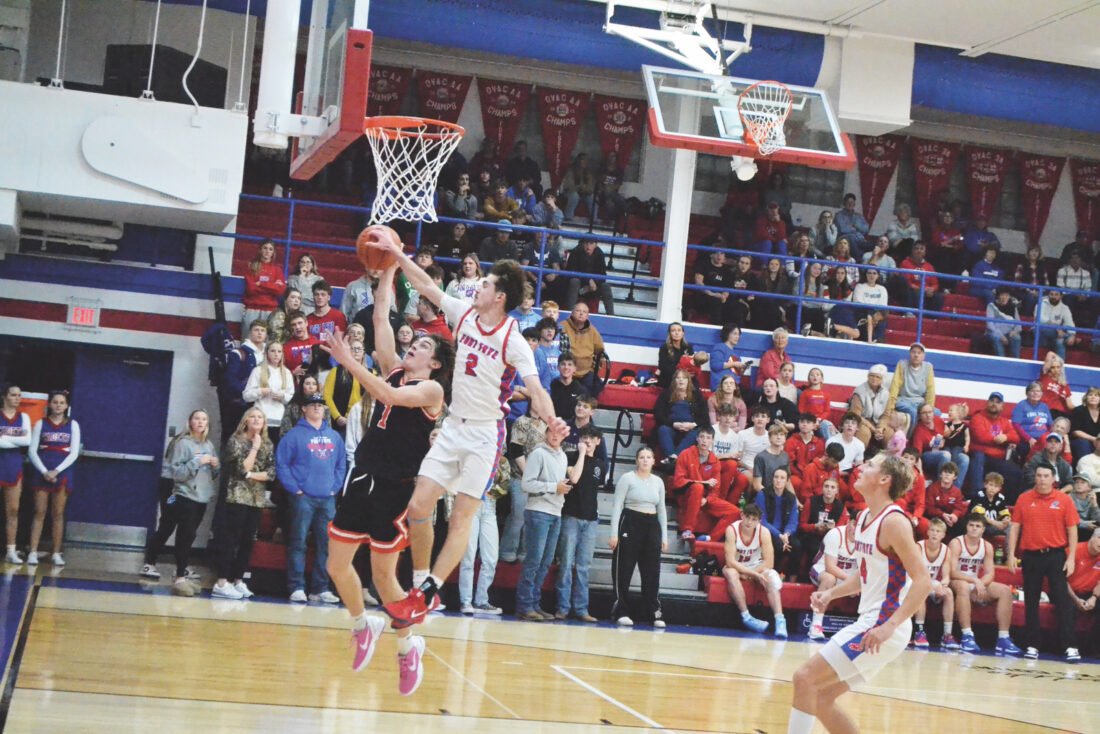 - (File Photo) Fort Frye’s Chatum Courson (2) blocks a shot by Marietta’s Lucas Miller during a high school basketball game last season in Beverly.