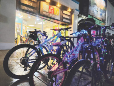 Around 20 people take off from the Marietta Adventure Company on Second Street Friday for the six-mile Marietta Holiday Lights Bicycle Tour.