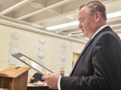 Marietta Mayor Josh Schlicher reads a letter of mayoral commendation recognizing members of Marietta police and fire departments as well as the Reno, Devola and Williamstown Volunteer Fire Departments for their actions following a structure fire on Tupper Street on Nov. 12. Read the full story online and in the weekend edition of The Marietta Times.