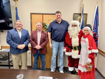 (Photo by Amber Phipps) Washington County Commissioners Charlie Schilling, Greg Nohe, and Eddie Place pose for a photo with Santa and Mrs. Claus on Thursday.