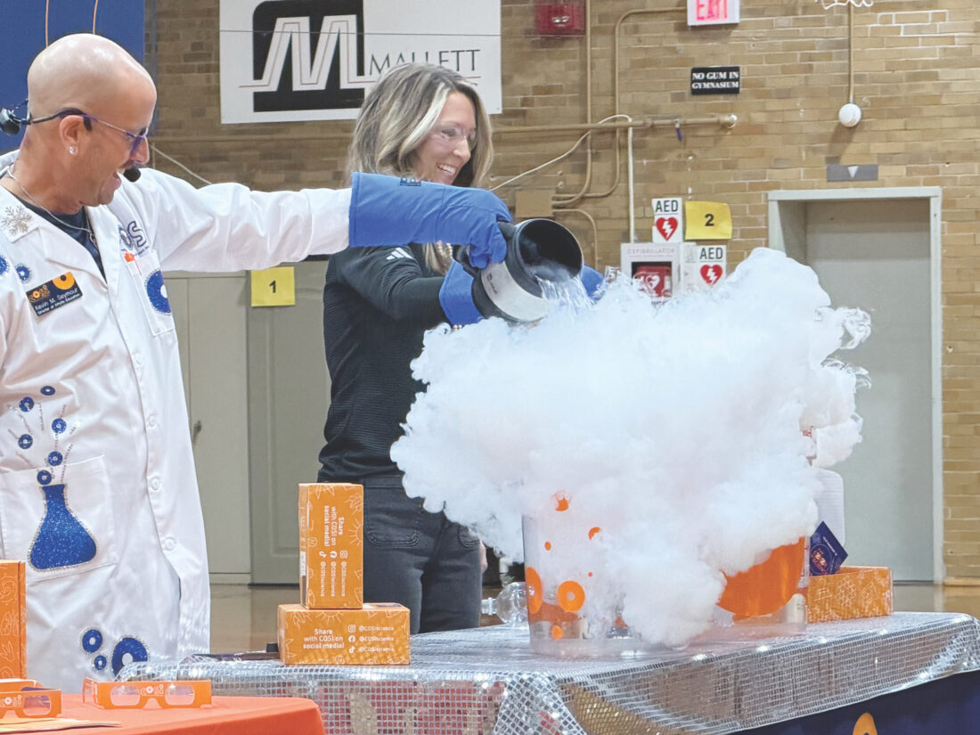 - (Photo by Amber Phipps) Kevin Seymour pours liquid nitrogen into water with the help of Brittany Schob for the COSI presentation at Marietta Elementary School on Friday.
