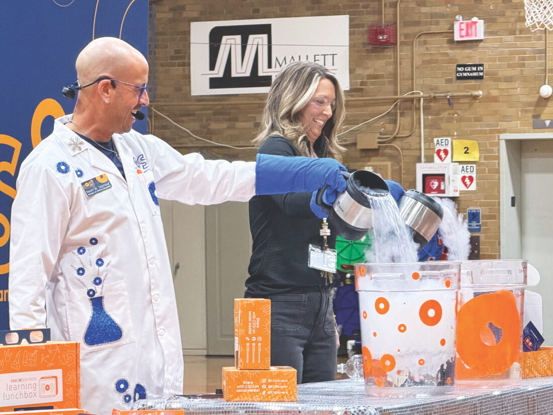 (Photo by Amber Phipps) Marietta Elementary School Principal Brittany Schob helps COSI Director of Offsite Education Kevin Seymour with a science experiment in the gymnasium on Friday.