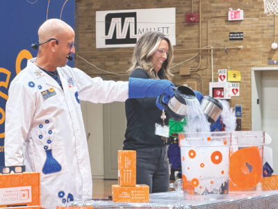 - (Photo by Amber Phipps) Kevin Seymour and Brittany Schob pour liquid nitrogen into water to create water vapor and nitrogen gas during the COSI demonstration at Marietta Elementary School on Friday.