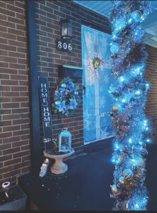 (Photo Provided) Blue lights adorn the cast iron railing at the home of Patsy and Tim Buckles-Martin, 806 47th St., Vienna. The home and others will be featured in the 2025 Holly trail on Saturday and Sunday, a fundraiser for the Parkersburg Woman’s Club.