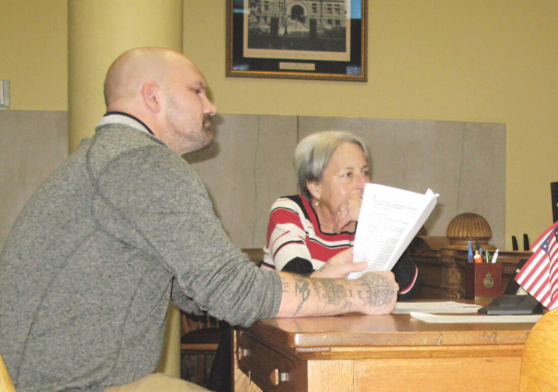 (Photo by Jess Mancini) Steve Belisky and Brenda Brum representing House to Home in Parkersburg discuss expansions and operations at the homeless day shelter with the Wood County Commission on Monday.