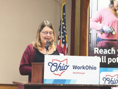 - (Photo by Amber Phipps) WorkOhio Southeast Ohio Regional Job Hub Leader Janelle Comstock speaks about why WorkOhio will impact workforces statewide at the Lafayette Hotel on Wednesday.