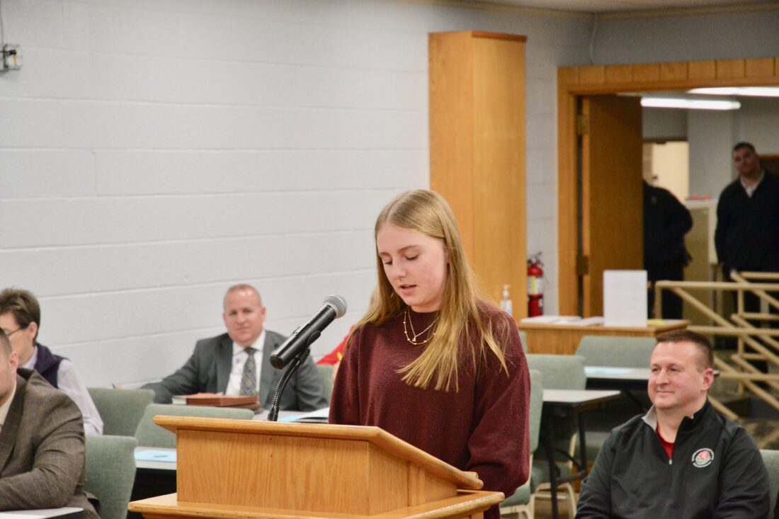 (Photo by Douglass Huxley) Aven Pifer, an eighth-grader at Edison Middle School, speaks to the Wood County Board of Education Tuesday night. Pifer is part of the Student Advisory Council where students from throughout the district can voice their concerns about events, about their facilities, and their experience as students.