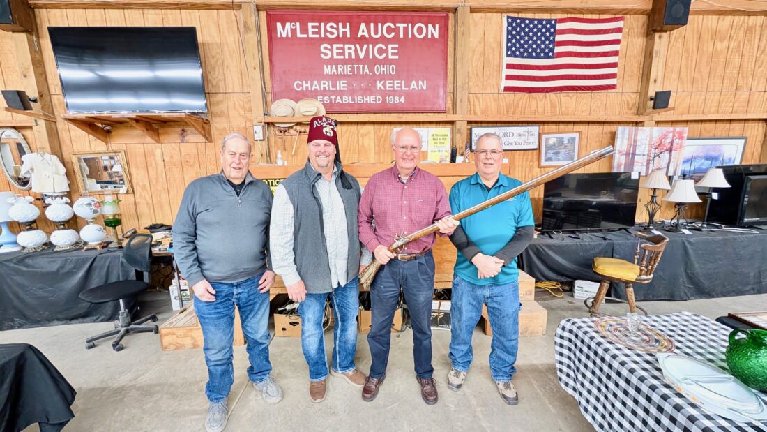 (Photo provided by Keelan McLeish) Transfer of ownership of Brooks’ Shriner Rifle to bidder Mike McCurdy. From left, auctioneer Charlie McLeish, Shriner’s Representative Todd Hetzer, Beverly resident Mike McCurdy and auctioneer Keelan McLeish.