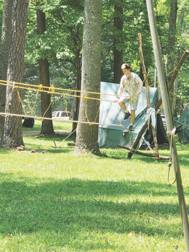 (Photo Provided) Zach Phillips crosses a rope bridge at Camp Kootaga during a Scouting event.