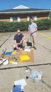 - (Photo Provided) Zach Phillips, standing, gets paint together with the help of his grandfather, Jerome Phillips, to paint the parking lot lines at Stout Memorial United Methodist for his Eagle Scout project.