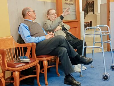 - (Photo by Jess Mancini) From left, Brian Raitz and Richard Hayhurst with the Parkersburg-Wood County Public Library appear before the Wood County Commission on Monday to discuss the proposed continuation of the library levy that expires in July 2028. The commission unanimously approved placing the renewal of the levy on the ballot of the May 12 primary election.
