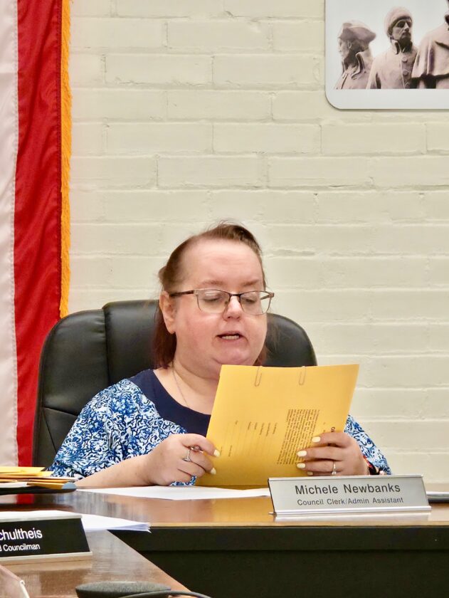 (Photo by Gwen Sour) Council Clerk Michele Newbanks reads Ordinance 28 (26-27), which would allot additional funding for the water treatment plant during Thursday’s Marietta City Council meeting.