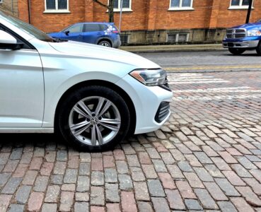 (Photo by Gwen Sour) A tire on a car warps as it traverses the bumpy bricks of Putnam Street in Marietta, Tuesday afternoon.
