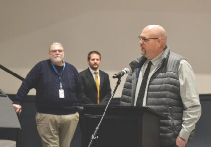 (Photo by Douglass Huxley) Hamilton Middle School teacher Stephen Tupitza talks to the Wood County Board of Education Tuesday night about how the merger with former VanDevender students is going. Students from VanDevender were split between Hamilton and Jackson middle schools after the school closed its doors for good at the end of the last school year. Hamilton Principal Kevin Campbell, back left, and Jackson Middle School Principal Kurt Echard also spoke to the board.