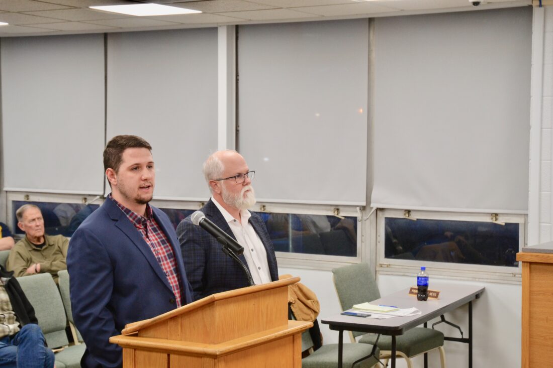 (Photo by Douglass Huxley) Sean Cottrill, assistant director of education design for Pickering Associates, and Ryan Taylor, CEO and president, talked to the Wood County Board of Education Tuesday night about renovations to Parkersburg High School’s historic stadium.