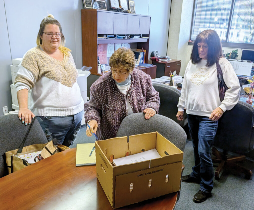 (Photo by Evan Bevins) Parkersburg City Clerk Connie Shaffer, left, looks over a box of petitions delivered to her office Friday afternoon by Parkersburg residents LaDonna Reid and Karen Riel. The petitions are for a referendum on a City Council ordinance approving a sanitation contract with Waste Management.