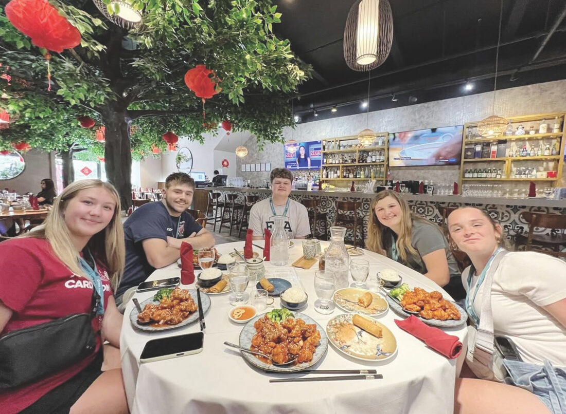 (Photo provided by Parker Burris) Parker Burris eats dinner at the National FFA Washington Leadership Conference alongside the Cardington FFA Chapter on May 2, 2025. From left, Ava Davis, Chris Kinsey, Burris, Kallie Boley and Hannah Weiker.