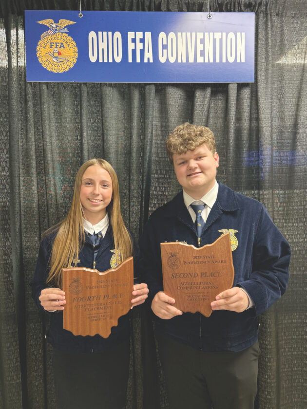- (Photo provided by Parker Burris) Reagan Witten, left, and Parker Burris pose for a photo after placing top four in their respective proficiency areas at the 2025 Ohio FFA State Convention May 2, 2025. Burris was awarded in the Agricultural Communications area.