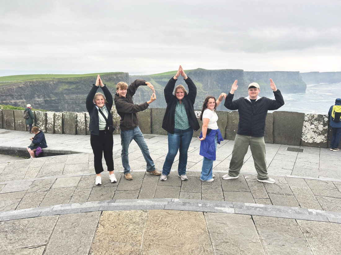 (Photo provided by Parkers Burris) From left, Kallie Boley, Harrison Miller, Reiley Miller, Hannah Weiker and Parker Burris at the Cliffs of Moher on June 13, 2025.