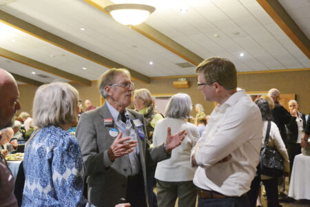 - Marietta residents Gwen and George Banziger talk to Ohio Secretary of State candidate Bryan Hambley at the 2026 Washington County Democratic Spring Dinner held at the Marietta Shrine Club on Friday. (Photo by Douglass Huxley)