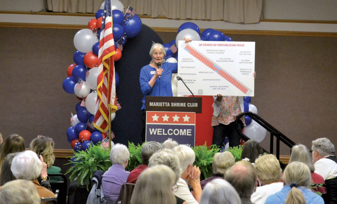 - Ohio House of Representatives District 94 candidate Wenda Sheard holds up a poster showing what she said was 30 years of Republican control that included bribery, corruption and sex scandals at the 2026 Washington County Democratic Spring Dinner held at the Marietta Shrine Club on Friday. (Photo by Douglass Huxley)