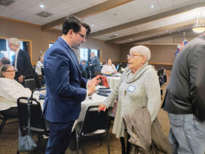 Elliot Forhan, candidate for Ohio Attorney General, speaks to Marietta resident Debbie Brown Friday before the start of the 2026 Spring Dinner fundraiser of the Washington County Democratic Party held at the Marietta Shrine Club. (Photo by Douglass Huxley)