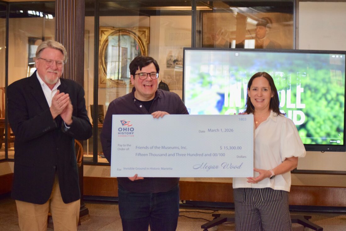 - (Photo by Amber Phipps) Ohio History Connection Program Manager Andy Verhoff, Invisible Ground Founder Brian Koscho and Northwest Territory Museum Society Executive Director Erin Augenstein on Monday hold a $15,300 check from Ohio History Connection for a state grant awarded to the Campus Martius Museum for the Invisible Ground in Marietta project.