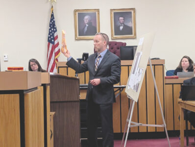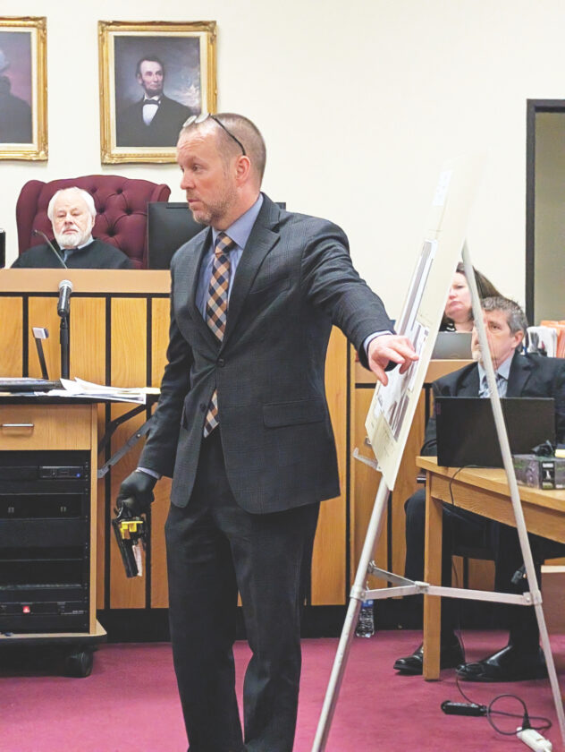 (Photo by Evan Bevins) Wood County Prosecutor Pat Lefebure holds the gun that was used to kill Matthew Bills as he points to a map of Bills’ home during closing arguments Friday in the murder trial of Barbara Cupp in Wood County Circuit Court. Cupp was found guilty of second-degree murder.