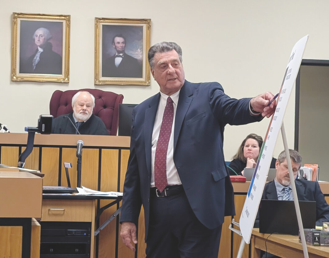 (Photo by Evan Bevins) Defense attorney George Cosenza uses a chart to explain the prosecution’s burden of proof in his closing argument Friday in the murder trial of Barbara Cupp in Wood County Circuit Court. Cupp was found guilty of second-degree murder.