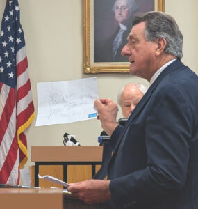 (Photo by Evan Bevins) Defense attorney George Cosenza holds up a note written by his client, Barbara Cupp, in the hospital during his closing argument in her trial Friday in Wood County Circuit Court. Cupp was found guilty of second-degree murder.