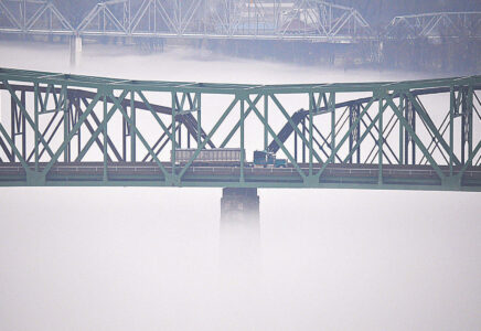 - (Photo by Art Smith) Fog from the Ohio River floats below the Parkersburg-Belpre Bridge as a truck makes its way across the river Wednesday morning.