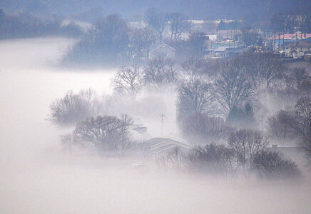 Fog from the Ohio River surrounds the trees near Belpre’s Civitan Park Wednesday morning. Temperatures are projected to reach the upper 70s Friday and Saturday, and a flood watch is in effect through this afternoon, according to the National Weather Service.