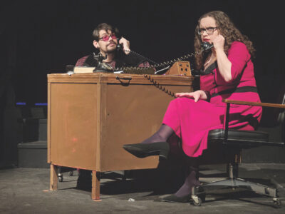 (Photo Provided) From left, Nicholas Rake as Dirk Gently and Rachel Gaston in several roles in “Dirk Gently’s Holistic Detective Agency” at the Mid-Ohio Valley Players Theatre. The show opens at 7:30 p.m. Friday for five performances.