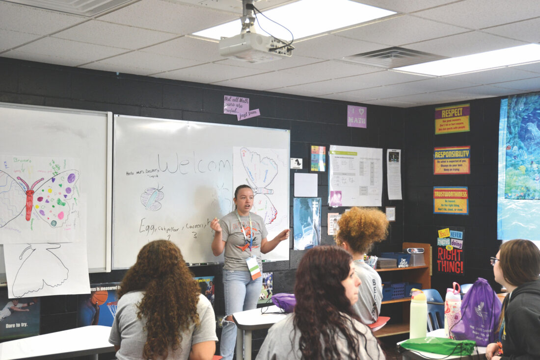 (Photo by Douglass Huxley) Belpre High School junior Bella Morrison leads a session Friday about personal growth and leadership traits using the metamorphosis of a butterfly during the 73rd annual Ohio Association of Student Leaders State Conference.