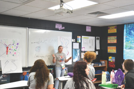 - (Photo by Douglass Huxley) Belpre High School junior Bella Morrison leads a session Friday about personal growth and leadership traits using the metamorphosis of a butterfly during the 73rd annual Ohio Association of Student Leaders State Conference.